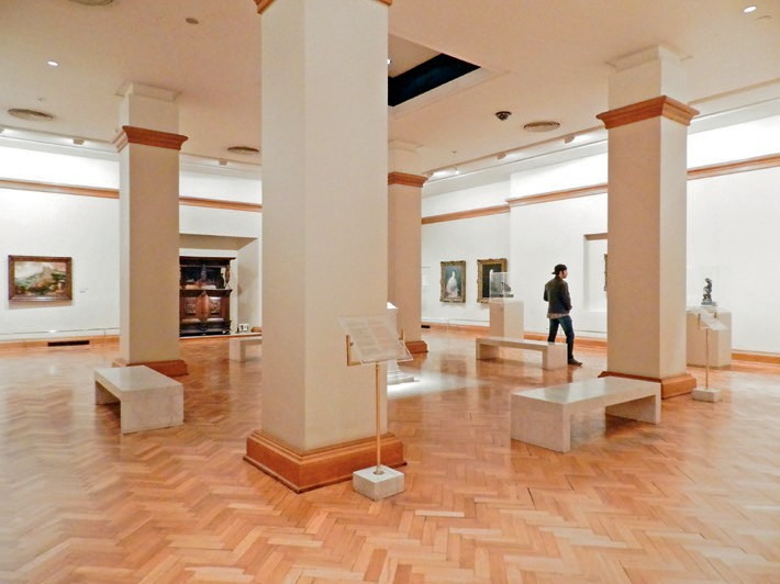 En cuanto al espacio general (Imagen 2), los detalles arquitectónicos y objetos espaciales dan cuenta de la no pertenencia de la sala al resto del museo. Asimismo, el tipo de materiales —parqué de diseño complejo (esto está en resto del museo), barandas doradas, cuatro columnas de 75 cm de lado en medio de la sala, molduras de madera en zócalo, cielorraso y columnas, como también molduras en las bases de las esculturas, ocupando mayor dimensión que las obras en sí— interrumpen la vista de las obras y desvían la atención a la distinción del edificio. Los bancos son de diseño minimalista pero su corporeidad también suma un elemento más que compite con los objetos de arte, o que más bien habilita una construcción de sentido particular, asociado a la alcurnia nacional y a la colección de obras como exhibición de riqueza y decoración. Lo mismo ocurre con las paredes, que, si bien son claras, justamente es por esta cualidad que acentúan los detalles decorativos arquitectónicos ya mencionados, así como las entrantes en los muros sugieren jerarquía entre las obras. La mayoría de estos elementos fueron evitados en las otras salas del MNBA, lo que sugiere la intervención de profesionales en su curaduría. Sin embargo, la sala Hirsch está notablemente diseñada, pero siguiendo criterios de decoración de interiores y mobiliario. No hay mayor recaudo en el modo en que las obras se enfrentan a los espectadores —incluso dejando a un lado la selección total—, como puede comprobarse en la mirada individual de las piezas. Nótese, por ejemplo, que el armario del S. XVII (ubicado en la pared sur) está escoltado por dos objetos contemporáneos de funcionamiento mecánico cuya función no puede adivinarse.10