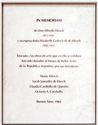 IN MEMORIAM Don Alfredo Hirsch (1872-1956)y su esposa Doña Elizabeth Gottschalk de Hirsch (1888-1965). Esta sala y las obras de arte que en ella se exhiben han sido donadas al Museo de Bellas Artesde la República Argentina, por sus herederos: Mario HirschSarah Saavedra de Hirsch Claudia Caravallo de Quentin Octavio A. Caraballo Buenos Aires, 1984.