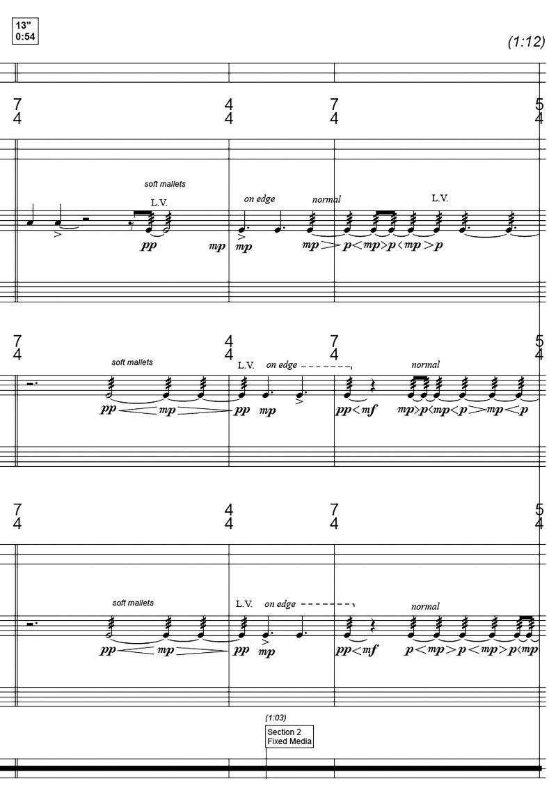 Dos tipos de gestos contrastantes se usan en la pieza. Uno de ellos se focaliza en el aspecto polirítmico de superponer fuentes, mientras que un segundo se focaliza en el movimiento y narrativa espacial del timbre a lo largo del espacio físico de la sala. Un hilo común para ambos es el enfoque tímbrico sobre materiales vibrantes que sirve como articulador estructural para la pieza. Es así que la estructura de la pieza juega con diferentes combinaciones y acoplamientos de materiales. Para algunas secciones, todo, los tres percusionistas y soporte fijo, comparten el mismo material como atributo tímbrico, mientras que en otras secciones cada fuente maneja independientemente su propio desarrollo tímbrico. Un ejemplo de timbre uniforme entre fuentes se encuentra en la sección 0:34 (figura 9), donde el gesto de duraciones sostenidas del tam-tam está ligado a mezclarse con los movimientos de paneo a través del sistema de parlantes del material del soporte fijo. Un ejemplo opuesto puede encontrarse en la sección 2:06 (figura 10), donde cada fuente presenta su propio desarrollo tímbrico.