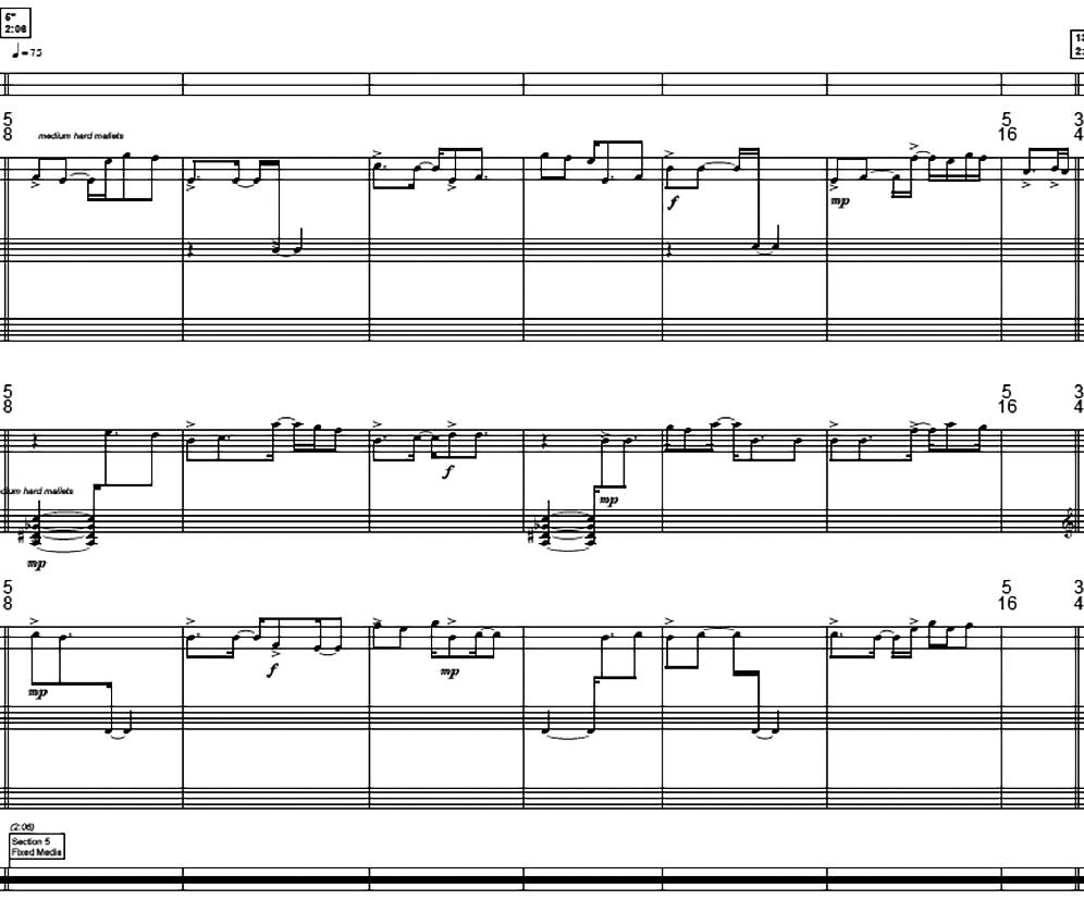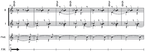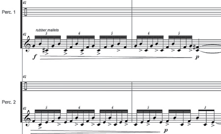 Otro aspecto de dificultad que se presenta en el uso de ritmos aditivos es el balance entre regularidad e irregularidad. Mientras que diferentes medidas de pulso se pueden contener linealmente en una misma estructura rítmica, el sentido o sensación de regularidad en niveles más altos que aquellos de la subdivisión del pulso pueden hacerse difíciles. Un recurso como contrapeso a esa dificultad es la de unificar el pulso a un único tempo para cumplir así la condición de regularidad, mientras que a su vez el pulso se subdivide en diferentes valores consecutivos dándose así la condición de irregularidad. Los valores consecutivos mantienen el flujo en la estructura rítmica y el agrupamiento de la secuencia de la subdivisión se trata de la misma manera como un ritmo aditivo se trataría, agrupando valores basados en la suma de una unidad básica. Un ejemplo de este recurso puede encontrarse en On Tessellation,4 donde dos capas rítmicas simultáneas cada una de ellas agrupando cinco pulsos de medida y dividida en un total de 23 ataques, puede subdividirse en dos combinaciones de diferentes agrupaciones: a. 3+4+5+6+5 y b. 5+4+5+4+5. Ambas capas tienen un nivel de irregularidad contenido en las subdivisiones del pulso, pero también tienen un nivel de regularidad en la cantidad de pulsos y uniformidad de pulso que ellas comparten (ver figura 2).Un detalle importante para mencionar, es que los patrones rítmicos y su carácter se mantienen reconocibles a pesar de los cambios en el flujo temporal. Para lograr esa característica es importante proveer a cada patrón con unas claves apropiadas para diferenciar dicho patrón de los demás sin importar el cambio de flujo. Es en ese sentido que acentuaciones de diferentes tipos son esenciales para la tarea. Acentuaciones sobre parámetros de duración, registro, timbre o articulación son algunos de los que permiten la diferenciación, pero a su vez suficientemente específicos para dar rasgos de reconocimiento a cada patrón independientemente. Este principio se aplica a todos las estructuras rítmicas aditivas lineales dando claridad, unidad y articulación a cada uno de los patrones.