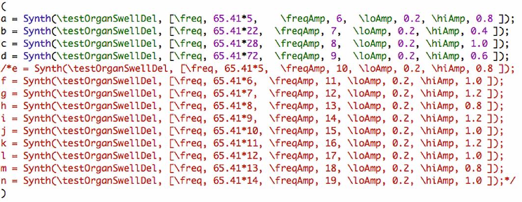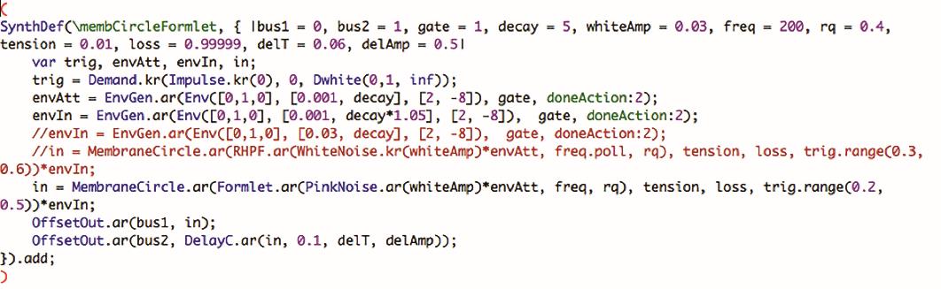 La modelación de envolventes de parciales específicos ofreció la oportunidad de destacar y desarrollar variaciones de timbres ya sintetizados. En ese sentido, para el diseño de timbres las envolventes se hacen un recurso importante.Dos aspectos más, relacionados con la síntesis de timbre relevantes son: la asignación de un timbre a un espacio virtual para que este resuene y un segundo involucrando, la simulación de materiales en vibración para producir una resonancia. Algunos ejemplos de este enfoque pueden oírse en el soporte fijo de On Tessellation,6 donde el planteamiento compositivo primario fue categorizar material sonoro acústico y electrónico a correspondientes referencias de materiales físicos, siendo estos: madera, membrana y metal. Una aproximación más al tema, puede encontrarse en la pieza Surfaces,7 donde el crecimiento gradual del material granular 8 muta a instancias graduales de componentes tímbricos de madera y metal. La intencionalidad con este tipo de síntesis tímbrica es el de hacer alusiones 9 a ciertos tipos de sonidos prototípicos y no de recrearlos o imitarlos.Como parte de la asignación del sonido a un espacio virtual, las líneas de retardo contribuyen como un factor importante para crear o recrear espacios resonantes del timbre que se está sintetizando.