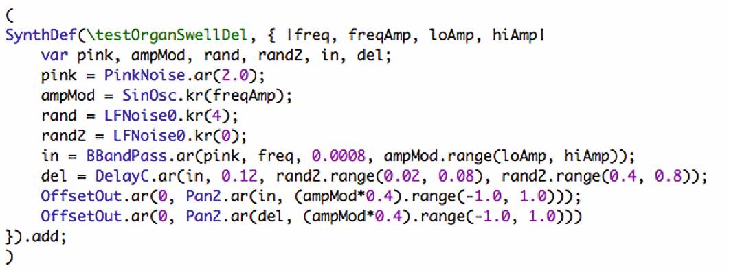 Para los casos mencionados, los tiempos de retardo usado en el material electrónico sintetizado oscilan entre 20 y 80 ms. A más corto el tiempo de retardo más angosto el ancho de proyección del sonido y más localizado en el plano estereofónico. Para una proyección más amplia/ancha los tiempos de retardo tienden a ser valores mayores, dado que los tiempos de retardo interaurales (ITD)10 son más largos. Valores más altos que 80 ms., caen en la categoría de ecos. En el marco de esta investigación, las líneas de retardo son muy útiles para destacar y replicar el carácter no-lineal del material primario de síntesis. La superposición de dicho material retardado le suma complejidad a una textura de por si ya compleja con un comportamiento interno activo, traduciéndose en timbres interesantes.El material primario de componentes parciales no-lineales se obtiene por medio del filtraje de ruido blanco o rosa a través de un filtro pasa-bandas con valores muy pequeños para el factor Q11 aislando y focalizando la salida de la frecuencia de corte del filtro. Un banco prototípico de filtros pasa-bandas de este tipo es el paso inicial para componer un timbre con una colección de parciales. Factores sutiles como el uso de diferentes generadores de sonidos para los componentes parciales contribuye a la complejidad del timbre. Envolventes y amplitud modulada de estos timbres contribuye también a la riqueza y actividad dinámica del timbre y sus componentes internos.