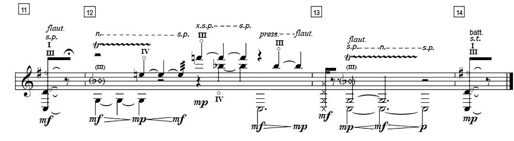 La combinación de estas variables permite un rango de timbres con diferentes grados de ruido. Es importante mencionar que el factor de ruido es intencionalmente sutil, apuntando a una transición suave de estados ruidosos a limpios del sonido del instrumento. Con relación a los timbres limpios, estos están caracterizados por ocurrencias de cuerdas dobles con combinaciones de cuerdas al aire y armónicos naturales. Es importante mencionar que los intervalos/dobles cuerdas seleccionados, juegan con diferentes grados de mixturas o mezclas siendo un parámetro importante para la estructura de la pieza. La distancia/extensión de los intervalos amplios entre combinaciones de cuerdas al aire y armónicos naturales hace difícil la percepción de dos alturas discretas sonando simultáneamente. La percepción tiende a ser una de un tono complejo con una mezcla de limitadores de alta y baja frecuencia.19