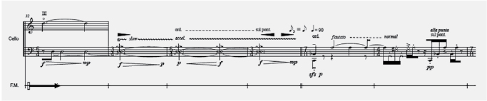 Es importante mencionar que el gesto principal a lo largo de la pieza para la parte de violonchelo es el de texturas prolongadas, al alcance y potencial que el instrumento ofrece en ese sentido. Las texturas están caracterizadas por grados de densidad basados en el nivel interno de actividad que sostiene la textura. El grado de actividad puede involucrar: densidad de alturas verticales, articulación y componentes de ruido. Para determinar niveles de densidad de alturas verticales se usan recursos de dobles y triples cuerdas además de multifónicos en una misma cuerda. De igual modo, para las articulaciones, el uso del arco ordinario, trinos y trémolos determinan grados o niveles de actividad interna. La presión en el arco y su posicionamiento en el instrumento son los que determinan el grado de actividad para el componente de ruido (figura 6). Es importante mencionar que la densidad puede observarse en un eje horizontal (temporal) a través de trinos y trémolos y vertical (timbre) a través de multifónicos o presión en el arco. Es en ese sentido que el grado de densidad puede fluctuar en ambos ejes alternativa o simultáneamente. La mayoría de estos elementos que he mencionado previamente pueden ser combinados entre ellos, permitiendo un flujo de transformaciones para los gestos.Como contraste a este material, secciones breves de desarrollo rítmico se contraponen a las secciones de texturas prolongadas. Estas secciones también toman el factor de contraste como motivo de desarrollo.