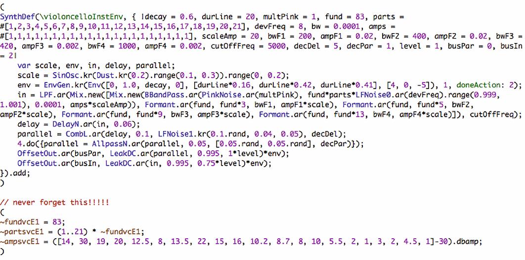 En todo caso, es importante mencionar que la caracterización de los tres timbres referenciados anteriormente es ambigua pues los tres acarrean un nivel de proporción entre ruido y tono, el cual fue útil para establecer los niveles de polaridad en las transiciones de los gestos aplicados al diseño de los instrumentos. Tres instrumentos principales se diseñaron para el soporte fijo. Los tres usaron el sistema de síntesis sustractiva/aditiva prototípico, usando procesos de filtraje diferentes para cada uno de ellos para moldear el tipo de timbres buscados. Para el caso del timbre flautato, que contiene en su emisión un alto componente de ruido, el instrumento diseñado uso envolventes de control para el ancho de banda de los filtros pasa-bandas que permitían grados sutiles de ruidosidad para los timbres de foco tónico. Para el caso del timbre de armónicos naturales, se usó un filtro variable de 12 dB, y una banda de supresión alta para aislar la frecuencia específica y obtener un timbre de foco/altura definida con características de emisión limpias y nitidez, y aun lo suficientemente inestables y de comportamiento no-lineal para un componente aditivo dinámico.Tres etapas de atributos tímbricos han sido referenciadas en los párrafos anteriores. Estos tres estados son el marco para el gesto principal o temático de la pieza, la cual es la transformación de un estado a otros a través de un puente de transición, siendo como se mencionó anteriormente, los estados conclusivos aquellos con timbres con componentes de ruido o su opuesto el de sonidos limpios/puros. El contorno o arco de estos procesos de transformación delinea las frases o gestos que ocurren en diferentes tipos de variaciones a lo largo de la pieza.
