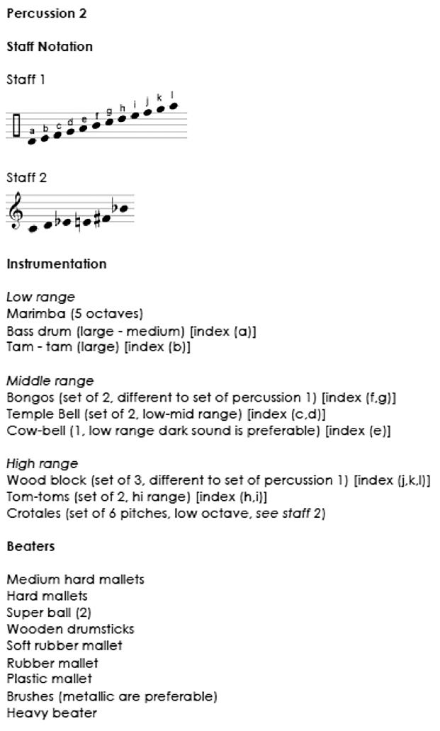 El enfoque principal está centrado en el desarrollo de atributos tímbricos de fuentes electrónicas y acústicas. Un segundo foco se centra en la distribución y atributos espaciales del material desarrollado dentro de los atributos tímbricos de las fuentes. Es en ese sentido que la selección de la instrumentación para la percusión se basa de acuerdo con el tipo de material vibrante resonante de los instrumentos de percusión, clasificados en: metálico, madera y membrana (figura 8). Esos materiales sirven igualmente como referencia para la generación de sonido sintetizado para componente de soporte fijo.