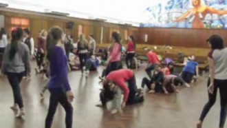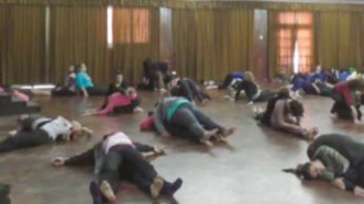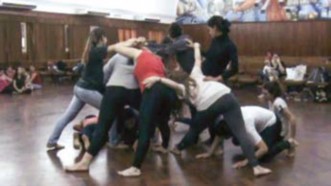 Trabajo de Sensopercepción, en el que investigan la descarga de peso del cuerpo al piso a través del cuerpo de una compañera.