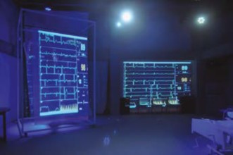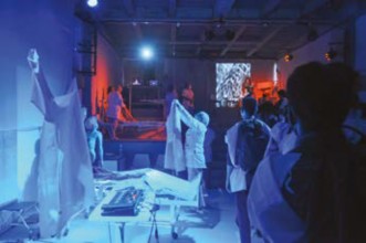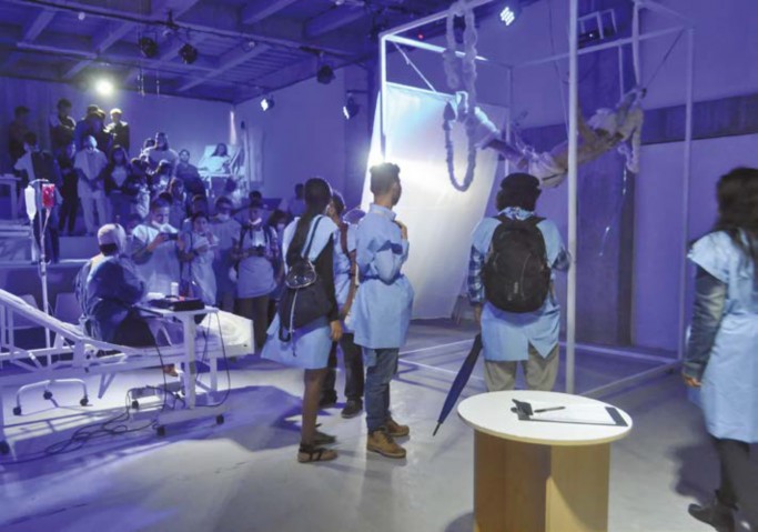 El primer impacto recibido lo componen imágenes de flujos, impulsos vitales y biomedidas que surten diversas máquinas y monitores de varios tamaños y apariencias, conformando con ello una “escenografía en movimiento” que responde, por su carácter digital, a un mundo plagado de máquinas. De esta manera, la UCI se construye a través de proyecciones de video y sonido, que envuelven al público y a médicos, enfermeras y auxiliares, quienes, con gestos a veces mustios y “malacarados”, a veces gestos de paz, transitan de aquí para allá entre tres camastros de hospital, desde donde se escucha el ritmo de respira- dores mecánicos, latidos y gemidos acompañantes de los pacientes internos. Al fondo del recinto y casi en la sombra, se encuentra una estructura metálica, de la cual se suspende un inquietante cuerpo humano. Dos personajes femeninos, aparentemente campesinas, con rasgos que pronuncian el dolor y la angustia, se entremezclan con el público. Hay una particularidad en este gran espacio de la UCI: no hay sillas, razón por la cual, el espectador-visitante irá encontrando un espacio, un rincón, un lugar donde estar. De tal manera, los visitantes deambulan de un lado para otro, como también lo hacen quienes representan el mundo de la salud.