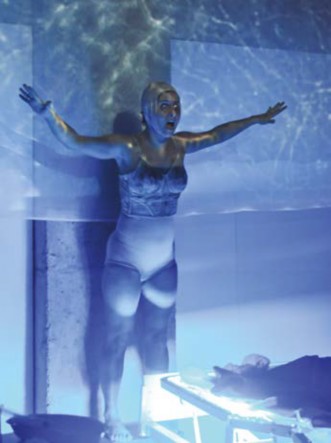 Dos videos, uno proyectado sobre el cuerpo de la actriz y otro sobre el escenario, provocan la inmersión del espectador en ese delirio, en ese estar “fuera” de la realidad, en esa demencia de quien se ubica en la delgada línea entre la vida y la muerte. Uno de los videos muestra el mundo celular —el que es proyectado sobre el cuerpo de la actriz— mientras el otro ofrece una mirada ampliada del universo, por lo cual se proyectó por todo el espacio escénico mientras la actriz hacía resonar un cuenco dando la sensación de giro en el espacio. Dos dimensiones de la vida: el mínimo está en el todo y el máximo está el mínimo, lo micro y lo macro con igual valoración. Ello hace posible instalar al performance y al performer en medio de dimensiones infinitas, incitando el conflicto del ser humano de percibirse dueño del universo, y al mismo tiempo, como dice Shakespeare en la voz de Hamlet, sentirse “encerrado en una cáscara de nuez”.
