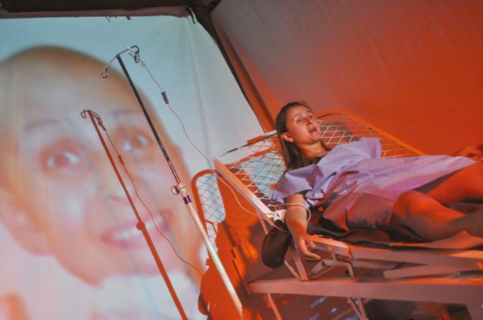 Finalmente, el cuerpo, postrado en cama, el cuerpo que es el lugar mismo de la pronunciación del performance. Como lo expresa Mary Douglas, las personas “tienen un cuerpo y son un cuerpo”. La experiencia del cuerpo físico, además, es percibida a través de unas categorías establecidas por el cuerpo social. Existe un intercambio constante de sentidos entre estas dos instancias, y lo que ve el espectador, es ese ser el cuerpo en tensión con la máquina, pero además esa visión cultural de la máquina como herramienta que expande o reemplaza al cuerpo mismo. Un cuerpo que es escaneado hueso a hueso, para luego descubrir en su imagen interior el jaguar que habita a la mujer indígena, o ese cuerpo cercenado y descabellado como tratamiento que responde a una esperanza de vida, ese cuerpo–instalación, suspendido, que no permite entender el grotesco límite entre la extremidad y la prótesis que la expande y reconfigura, o ese cuerpo propio del performance digital que se extiende, se hibrida y se deslimita a través de la tecnología (Bay–Cheng, 2010), la paciente que encuentra placer manipulando el sonido de su tos estertórea, usando una looper machine para su amplificación y réplica sonora.