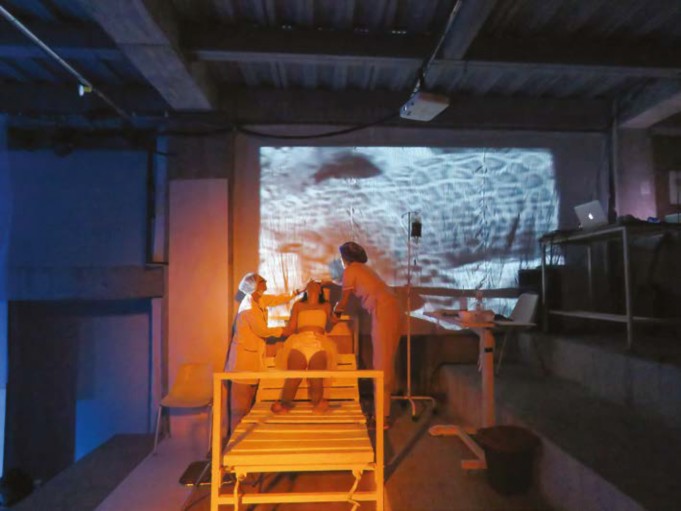 En esta escena, la directora, Verónica Fabrini pone en cuestión el no lugar de las creencias y cosmogonías de ciertas culturas, dentro de estos espacios de cuidados intensivos, que son producto del paradigma occidental. Nos muestra la fragilidad, la no inclusión de la cultura indígena, la negación y por ende desaparición de su caudal de conocimientos, sabidurías, riquezas estéticas y culturales. En la escena se muestra el manto protector de la tecnología clínica y de la medicina alopática, pero el performance de las actrices irá poco a poco constru- yendo un entorno cosmogónico y el público apreciará la aparición de árboles, semillas, instrumentos musicales y pinturas corporales. En términos sonoros, esta visión es acompañada por la obra La voz del shaman 2, con su sonido de pájaros y agua que se mueve circundante en el espacio, entablando un diálogo entre la vida y los seres humanos, enunciando los ciclos de nacimiento y muerte.