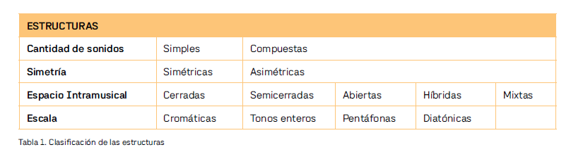 Los aislamientos temporales son fragmentos musicales con una precisa indicación métrico-temporal que están insertados dentro de otra imperante temporalidad. Los conjuntos son grupos de sonidos no ordenados, y seleccionados de acuerdo a su ritmo, altura y registro (Straus, 2005).Para el análisis a nivel de microestructura se utilizan dos conceptos fundamentales: estructuras (Tabla 1) y desplazamientos. Ambos podrán ser externos (se utilizan en diferentes Móviles de la serie) o internos (si solo se utilizan en un Móvil). Llamaremos estructuras a las diferentes organizaciones y distribuciones que formen dos (simples) o más sonidos (compuestas) en la vertical del espacio musical audible. También podrán clasificarse de acuerdo a su colocación en el espacio intramusical: cerradas (clústeres no necesariamente cromáticos), semicerradas (quasiclústeres o clústeres con pequeños espacios vacíos), abiertas (cuando existen grandes distancias entre los sonidos) e híbridas (pequeños clústeres separados por grandes intervalos). Además, pueden ser catalogados de acuerdo a las alturas o escala utilizada: cromáticas, por tonos ente- ros, pentáfonas, diatónicas o mixtas; por último, pueden clasificarse en simétricas o asimétricas.