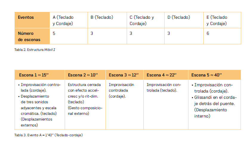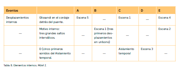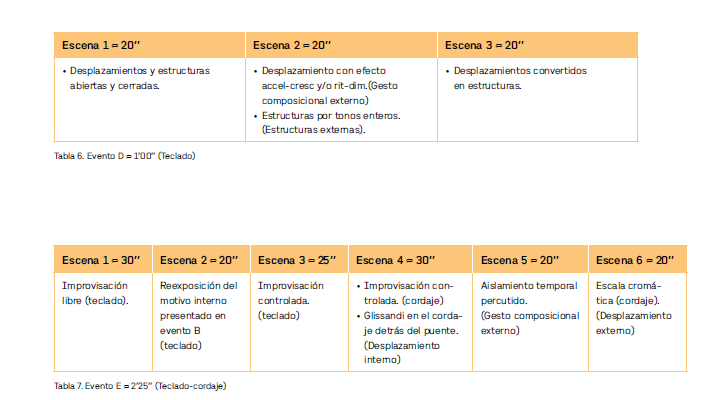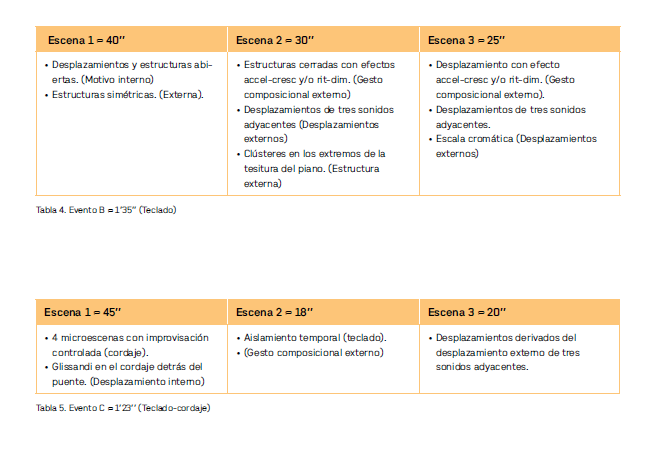 Nos auxiliamos de la organización temporal realizada por el compositor para definir las escenas, pero también tenemos en cuenta los giros tímbricos (Evento B, escenas 1 y 2), los cambios de tesitura o espacio intramusical (Evento A, escenas 1 y 2), diferencias en la concepción estética (Evento E, escenas 1 y 2) o intervenciones de gestos composicionales (Evento E, escena 5).
