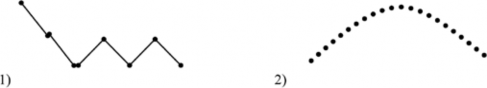 Denominamos desplazamientos (Figura 1) a secuencias de dos o más sonidos intercaladas por una pausa o silencio. Un desplazamiento puede convertirse en estructura si sus sonidos se mantienen sonando, pero por razones organizativas-metodológicas lo llama- remos desplazamientos teniendo en cuenta solo sus condiciones iniciales. Nos auxiliaremos de las siguientes simbologías para los desplazamientos donde los puntos representan los sonidos y las líneas o curvas nos informan acerca de la dirección del movimiento (sin especificar intervalo). El desplazamiento 1 consta de siete sonidos que primero tienen un movimiento descendente en la tesitura para luego fluctuar los ascensos y descensos, sin embargo, el desplazamientotiene nueve sonidos que ascienden y luego descienden sin fluctuación alguna. De esta manera podremos caracterizar y reconocer los desplazamientos en cuanto a la forma de manipular la espacialidad interna.