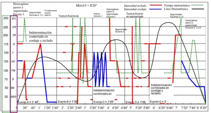 El gráfico Espacio intramusical nos muestra el equilibrio que tiene el Móvil I en el manejo del espacio musical interno. En los Eventos extremos A y E se utiliza prácticamente todo el espacio intramusical del piano mediante extensos desplazamientos, compactos bloques sonoros (teclado), sonidos aislados (teclado y cordaje) o atmósferas indeterminadas (cordaje). A través del enrarecimiento y la condensación de los sonidos en el teclado se distribuye el espacio en los Eventos B y D; ahora las estructuras son abiertas, semicerradas o complejas. En el Evento central C la balanza del espacio usado se inclina a las medias-bajas y bajas frecuencias, mientras que, al igual que en los extremos de la obra, se manifiesta el equilibrio (tímbrico) entre el cordaje y el teclado. Sin duda, la gestualidad de los intérpretes amplificará la dimensión visual de esta obra, así como su espacialidad externo musical. La acción y los movimientos constituyen una extensión del instrumento para provocar de forma más efectiva al perceptor.