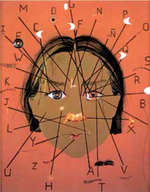 En una primera fase de interpretación, la pintura (véase Imagen 3) se encuentra en un espacio ficticio de color marrón, en donde la composición centra la cabeza femenina de la autora, sin señas de su cuello, y se crea la ilusión de que esta parte del cuerpo flota. Además, se encuentran líneas en distintas direcciones para indicar un punto concreto de su rostro, a algunas les corresponde una letra a otras un fragmento de un rasgo físico.