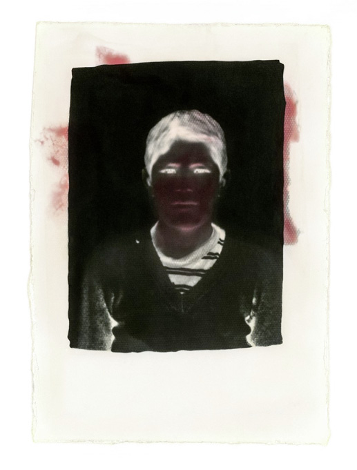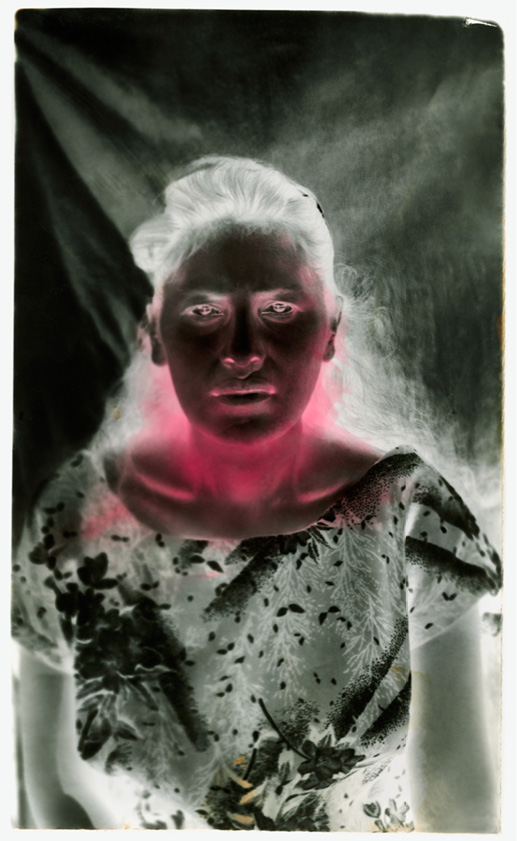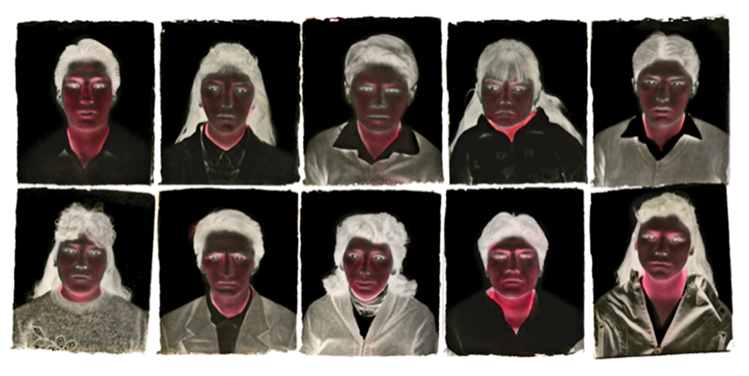 A partir de ello, en Bajo el sol negro, la artista hace uso de la misma técnica, pero en este caso las fotografías son copiadas como negativos, es decir no pasan al positivo. Con esta operación de truncar la etapa final de la práctica de los minuteros y exponer el negativo intervenido con la emulsión rojiza, De la Torre propone visibilizar esta intervención de la imagen que genera un ‘aclaramiento’ de la piel, para dejar al descubierto el artilugio técnico del emblanquecimiento. La imagen en negativo pasa a ser la forma final de la obra, la película rojiza (invisibilizada por el re-fotografiado del negativo en la práctica de los minuteros) queda expuesta como máscara, sugiriendo las operaciones que contribuían a naturalizar ciertos vestigios coloniales de violencia racial y social a través de un ‘inocente’ retoque que produce un ‘efecto de blancura’.