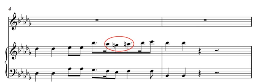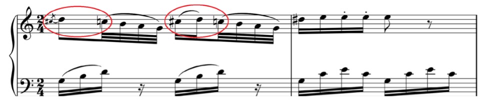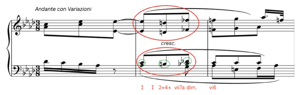 En el ejemplo siguiente también observamos como el movimiento circular primario provoca una pequeña tensión no solo a nivel melódico sino también armónico* en el tema B de la exposición de la Sonata nº 12 en La bemol mayor op. 26 (compás nº 21) de Ludwig V. Beethoven (1770 – 1827), compuesta entre 1800 y 1801.
