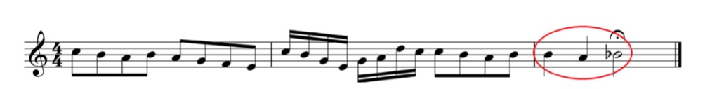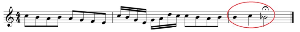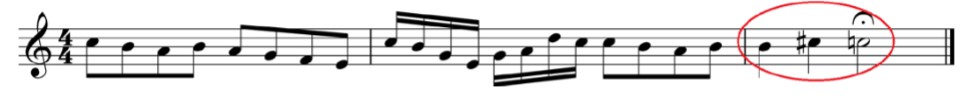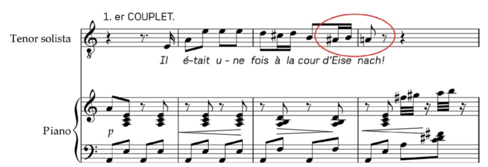 Aquí, observamos que el movimiento circular primario con semitono ascendente produce un cierre notable a la primera frase* del aria “Il ètait une fois à la cour d’Eisenach” de la Ópera “Los cuentos de Hoffmann (1880) de Jacques Offenbach”. Esto sucede porque este tipo de movimiento circular primario posee un final descendente lo cual provoca una sensación de conclusión a la idea musical en cuestión.