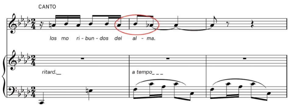En la siguiente composición el movimiento circular primario con semitono ascendente es utilizado para realizar una elisión* entre dos secciones: estrofa —interludio. Se deduce esto porque el movimiento circular primario con semitono ascendente genera dos modificaciones en el final de la estrofa, primero lo altera y luego vuelve la escala en la cual se desarrolla la obra, favoreciendo de alguna u otra manera a la unión entre ambas secciones.