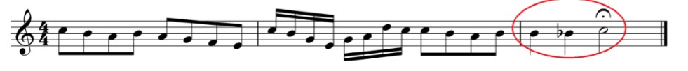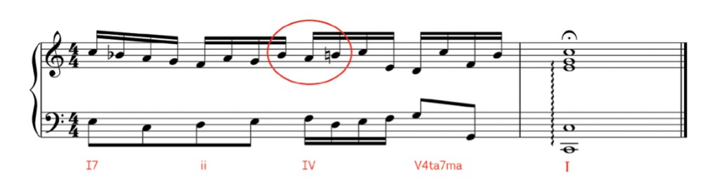 En este caso el movimiento circular primario ocasiona dos alteraciones accidentales* sobre el V grado de la escala de Do mayor. Un acorde con 5ª menor y luego un acorde suspendido*. Modificando claramente a la melodía y a la armonía.