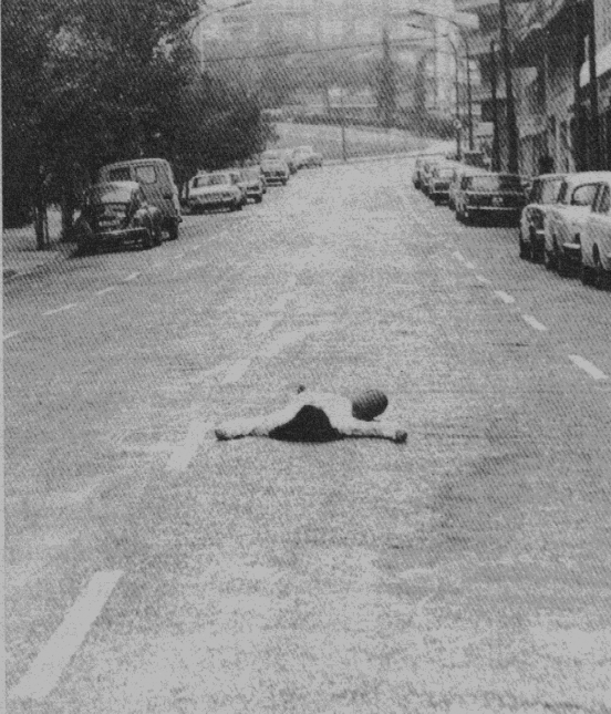 La doble denegación formulada por Ubersfeld en su lúcida obra «Semiótica Teatral» (1989) funciona como otra constante en buena parte del teatro universal. Esta tesis de la autora francesa posiciona en un mismo plano existencial lo que sabemos que no es real y lo que llega a formar parte de nuestra realidad por el simple hecho de estar vivos. Esta situación, frecuente para el espectador, nos enfrenta con un existir falso que encuentra su justificación y razón de ser en esa «zona privilegiada en la que el teatro se dice como tal teatro» (Ubersfeld, 1989, p. 18). Es decir, somos testigos de una escena que, aun utilizando formas de lo real, plantea una ilusión. Esta contraposición entre ficción y realidad nos parece especialmente interesante si lo comparamos con la autenticidad que prevalece en muchas de las performances desarrolladas en el periodo que estamos analizando. Para entenderlo mejor, detengámonos en dos casos que ilustran claramente lo que estamos afirmando. Cuando, en el tercer y último acto de «La casa de Bernarda Alba» descubrimos que Adela se suicida porque cree que su amante, Pepe el Romano, ha sido asesinado por su madre, lógico es pensar que la actriz que encarna a Adela realmente no pierde la vida en el escenario. Cuando, en 1973, la artista de performance Alicia Fingerhut se tumba en medio de una calle de Barcelona paralizando el tráfico, sabemos que Fingerhut arriesgó realmente su integridad física [Fig. 3]. No había ficción en esa acción, los coches pasaban y se detenían para no atropellar a un cuerpo que yacía, inerte, sobre el asfalto.