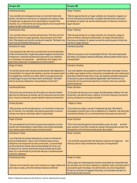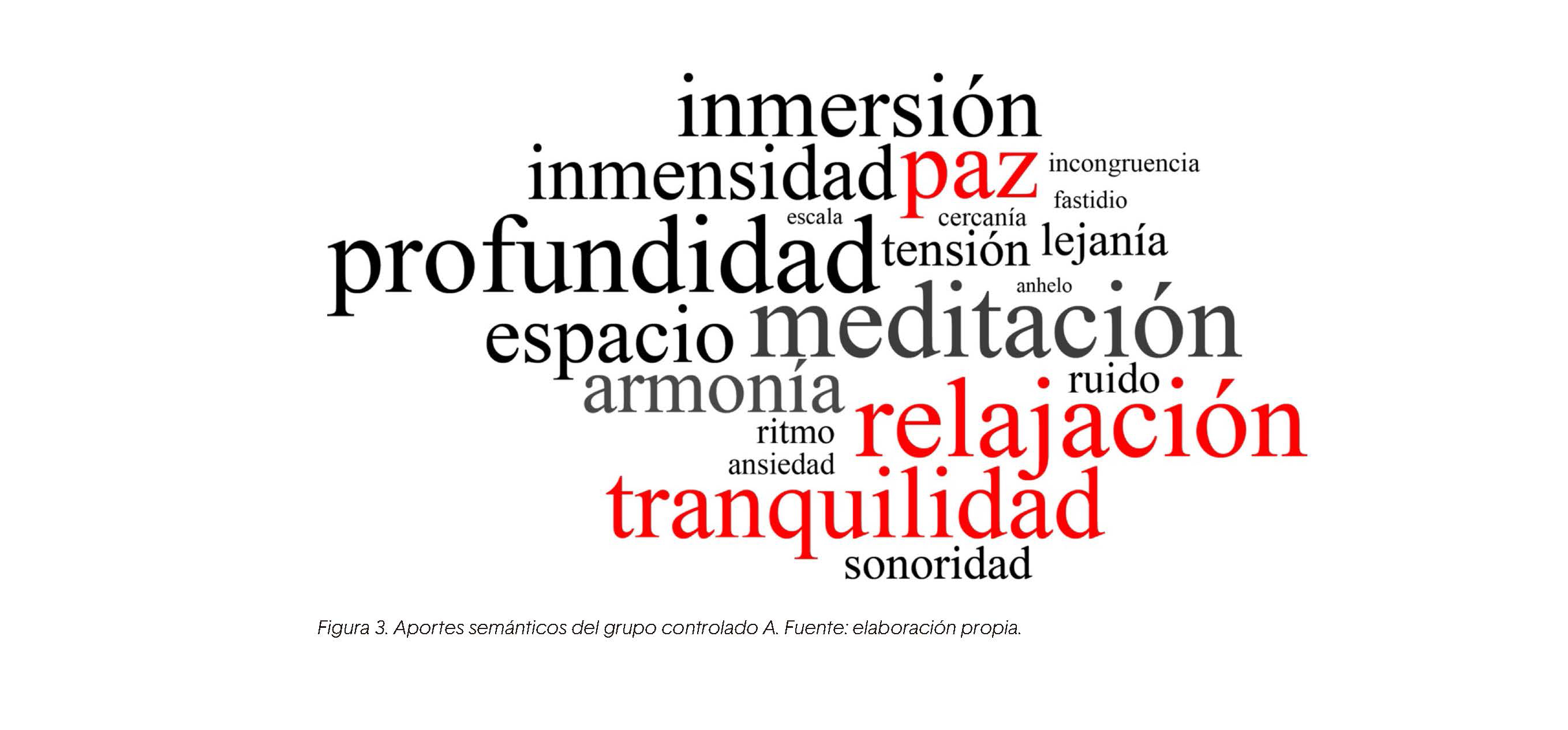 En lo que refiere al nivel representativo que tuvo origen en el espacio inmersivo, los aportes semánticos fueron el medio para comprenderlos, estos se vincularon con la conciencia y las emociones. Por un lado, la concurrencia de los conceptos de tranquilidad, relajación y paz configuraron la escucha inmersiva en ambos grupos, al mismo tiempo ofrecieron una muestra sobre el sentir de la población.