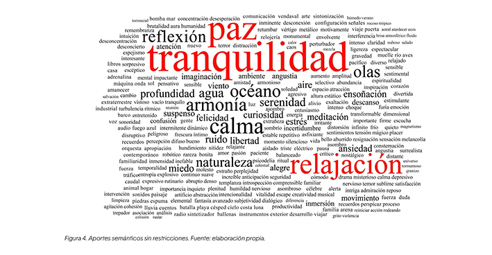 En los aportes semánticos se aclara dicha situación, primeramente, las unidades desagregadas simbolizaron nociones y abstracciones universales que tienen su fundamento en una realidad socialenmarcada por un momento histórico. En otra perspectiva, la manipulación de conceptos en la encuesta “A” versus la libertad para escribir conceptos en la encuesta “B”, expuso diferencias a través de sustantivos concretos y abstractos como mar, calma, armonía, naturaleza, olas, reflejo, serenidad y agua. Los sustantivos del grupo “B” fueron producto de inevitables interpretaciones que tuvieron su origen en la retórica del pensamiento metafórico (Campbell, 2020). Esto permitió ubicar semejanzas entre la escucha, su interpretación y su narración ecfrástica, además de ubicar momentáneamente el mecanismo de la imaginación. En otras palabras, se ubicó el funcionamiento del instrumento cognitivo humano que permite inquirir sobre el significado de lo que se percibe.