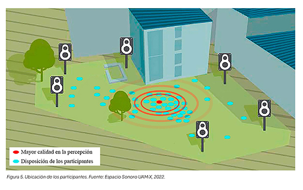 El psicólogo Michael Maher (2018) propone que en las operaciones del pensamiento la mente se aferra a rasgos generales de las cosas, con recuerdos que se conforman de relaciones de causa-efecto, sustancia-accidente, unidad, pluralidad y conexiones de espacio y tiempo. Asimismo, se designan modos específicos de percepción en la conciencia que se conectan con las emociones, la atención, la conciencia, los sentimientos, el aprendizaje y la inteligencia. Por lo tanto, los resultados ecfrásticos confirmaron dichas operaciones del pensamiento, producto de un estímulo inmersivo.Cabe señalar que durante el experimento de audición la ubicación de cada participante no modificó su percepción, a pesar de ubicar diferencias audibles con mínimos cambios de intensidad. Véase figura 5.