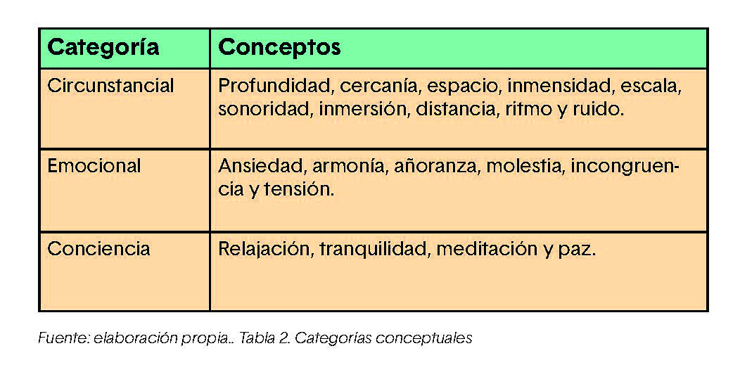 Continuando con las encuestas, se planearon dos instrumentos que tuvieron como guía una sola pregunta: ¿Qué significado tiene para ti lo que escuchas? La primera encuesta se denominó “A” y pedíareflexionar sobre la escucha eligiendo seis palabras de una lista de 20 conceptos relacionados con la percepción auditiva, y posteriormente escribir una écfrasis. Los conceptos fueron manipulados para expresar el momento de la audición. La lista de categorías y sus conceptos se muestran en la siguiente tabla 2.
