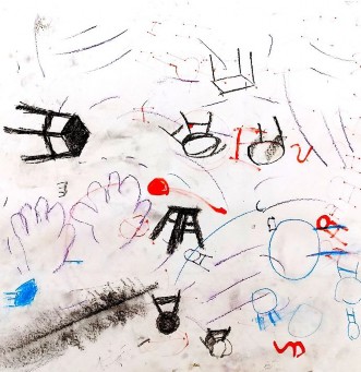 Hoy la actividad fue muy chévere porque cogimos una hoja, nos la pusimos en la cara y dibujamos nuestro rostro sin lápiz, solo con nuestra mano. A lo que sosteníamos la hoja en el rostro estamos formando nuestra propia cara sin ningún otro elemento, describe Jesús Buitrago. Una actividad sencilla con la que se logra transmitir y experimentar el dibujo, desde la intervención de formas que generan cuerpo. Las manos se vuelven escultoras, no se requiere nada más, simplemente se dejan llevar, se buscan las formas que resultan en cuerpo. Dichos objetos refieren las formas para el cuerpo, ya que cada oficio tiene unas maneras particulares. El reconocimiento del cuerpo del otro es el reconocimiento de los objetos y las labores que produce; pero, sobre todo, de entender que al igual el propio cuerpo se está definiendo para los demás, por lo cual significa una intersección de partes que configuran la realidad del barrio en el cual todos son importantes, porque definen unas particularidades concretas.