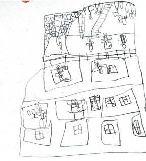 Mariana Orjuela, de ocho años reflexiona que el límite Es como las puntas, por ejemplo, el límite de los edificios son sus puntas, de modo que se hace una relación de la línea con las fronteras del entorno. Esto permite imaginar cómo en un dibujo, al juntarse las líneas,se marca el límite. El ejemplo del edificio posibilita comprender que los extremos están definidos por relaciones de extremos. Hay una línea interpretativa que marca el límite, que separa, que constituye el fin del objeto y comienzo del espacio que rodea la frontera trazada. Lo mismo sucede en el exterior, las líneas que definen los comercios y los espacios que ocupa cada labor en torno a ello. Por los límites podemos separar e identificar las diversas líneas que nos rodean, agrega Mariana.