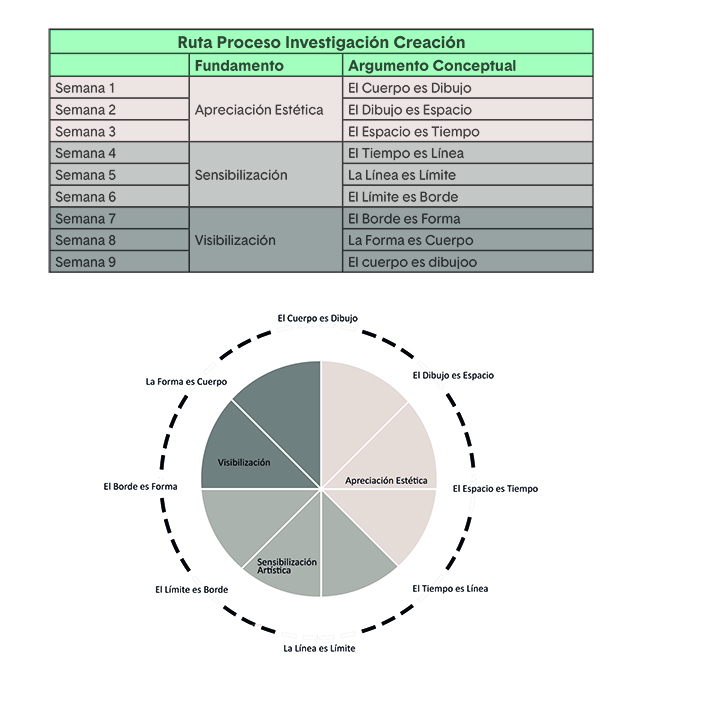 Así entonces, desde el desarrollo de ejercicios semanales, se establecen relaciones que exploran el dibujo como un suceso cíclico, que vuelve sobre sí mismo en su punto de partida, sobre el cual se generan relaciones transversales, ya que dicho argumento se concibe como un suceso sumado.