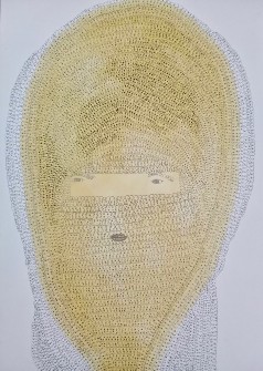 En este caso, la imagen de estos dibujos que forman parte de una serie iniciada por la artista en 2010 surge a partir de una mancha de aceite de lino, sustancia básica para la tradicional preparación del pigmento al óleo, que en este caso es empleada como medio o factor cromático en sí. Claudia del Río juega con su oleosidad amarilla, la domina y la esparce sobre el papel dosis con distintas intensidades. La mancha amarillenta inicia así su propio ciclo de expansión, evanescente y a la vez grasosa, sobre la superficie. “En la viscosidad del aceite, en ese movimiento que tiene en sí mismo, encontré una falta de control que andaba buscando” (del Río, 2016, pp. 248-249). Una vez seca esa superficie de base semanas, a veces meses después, la artista surca la aureola oleosa con líneas sinuosas que tejen una trama de arabescos, que ella homologa al registro del canto del zorzal2. Las líneas son fluidas pero controladas para definir esa imagen en principio amorfa. Los trazos del grafito completan la representación, las manchas se transforman en siluetas y son resueltas como cabezas con rasgos sintéticos: lo amorfo deviene antropomorfo (Imagen 1).