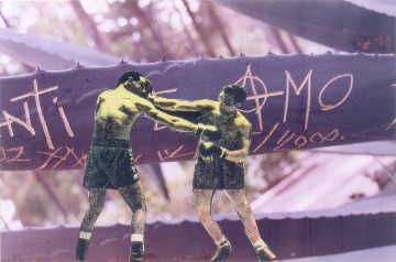 Y es que, en efecto, la pregunta por “lo argentino”, como ya se ha mencionado en relación con los Criollos, es otra cuestión que enlaza distintos momentos del trabajo de Claudia del Río. Una referencia recurrente es el boxeo, al que ella considera “deporte nacional” (Imagen 4). En la performance que organizó junto a Carlos Herrera y se desarrolló en el Salón La Capital (Museo Castagnino, 2003), tres parejas de boxeadores profesionales iban desarmando, a partir de su movimiento en el espacio, un improbable ring cuya base era un cuadrado de polvo blanco. En la misma institución había presentado en 1997, bajo el título Segundos afuera, grandes fotos de boxeadores sobre diseños geométricos de clara raigambre modernista. Se trataba de una apropiación de tapas de la revista Boxing, publicada en la Argentina en los años veinte, sobre las que la artista producía un cierto extrañamiento con la ampliación fotográfica de su escala original y la adhesión a la superficie de elementos como fieltro o papel celofán transparente con una trama de puntos blancos que simula el plumetí: es el tipo de papel utilizado para envolver arreglos florales que aquí es empleado a la manera del tul de las novias.