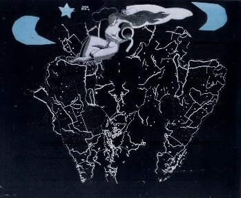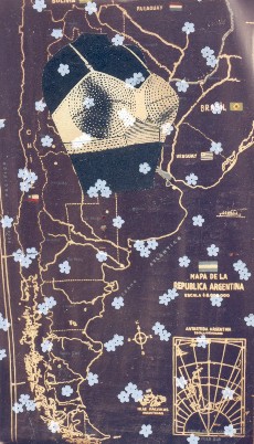 La consideración de la artista de los mapas como “dibujos opacos” y materia prima para su lectura geopolítica se remontan a la foto que había tomado de un mapa dibujado en una sucursal del Correo Argentino; era una imagen sintética, de fondo negro y líneas blancas para delimitar el límite nacional y los interprovinciales. A partir de ese registro inicial, el mapa fue fotocopiado, invertido, recortado, reducido, con partes suprimidas y finalmente editado en forma digital (comunicación personal, febrero 23, 2014). Claudia realizó con Nerviosa geografía un conjunto de impresiones en grandes dimensiones, donde las líneas blancas sobre fondo rojo o negro aluden a la cartografía pero a la vez estallan las referencias a los límites de esa geografía nacional: los límites interprovinciales se han convertido en un ramillete de terminales nerviosas cercanas a configuraciones caleidoscópicas, absurdos esquemas para un heterodoxo test de Rorschach o, en clave política, “metáforas del descuartizamiento de un territorio y su posterior reconstrucción en otra cosa, falsamente decorativa. Estas cartografías aluden a un cuerpo o tejido social enfermo, que exhibe cierta anomalía” (del Río en Laudanno, 2001).