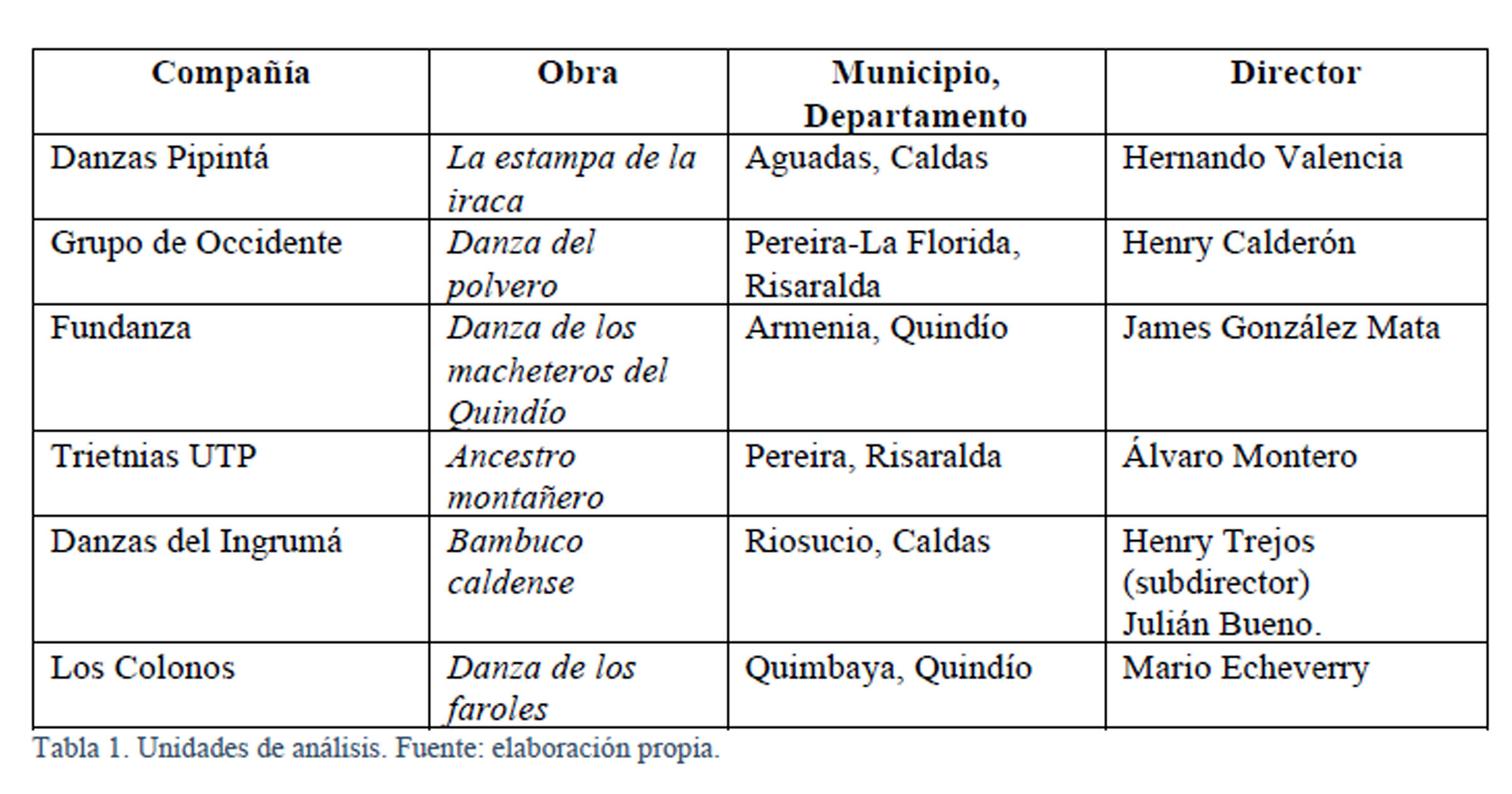 Para esto se realizó la validación por juicio de expertos, tres maestros de la danza que referenciaron compañías o escuelas de danza que tuvieran obras originales en los municipios del PCC, considerando importante tener representación de los tres departamentos del Eje Cafetero. Con las coincidencias de los expertos, se conformó una la lista de unidades de análisis que se detallan en la tabla 1