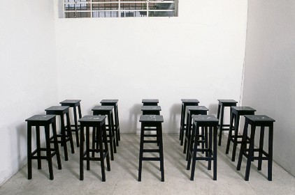 Sobre esta macabra escena llega la noticia a González en ese año de 17 jóvenes que murieron en la masacre de Naya–solo los años y la investigación posterior han develado hechos y cifras–. En memoria de estos jóvenes, González dedica 17 taburetes sobre los que pinta la imagen de su cuadro Empalizada (2001). El cuadro es uno cargado de dolor: la empalizada que debía proteger deja expuesta, desnuda, abierta a la mujer que allí se postra; al otro lado de la empalizada se llora y se cubren los ojos, pero a este lado, al de la mirada, una mujer llora desnuda su pérdida, en cuatro, sobre la tapa de un féretro. Frente a la empalizada, a este lado del cuadro, para el espectador es inevitable verla vulnerable, disponible, como si la fuerza que debía protegerla fuera a devorarla, ultrajarla, empalarla en cualquier momento. Ese símbolo de vulnerabilidad y disponibilidad de la vida nuda se traslada sobre los taburetes para señalar la pérdida de esos jóvenes y darles un lugar colectivo, más allá de la cifra y la noticia. Tan es así que en 2020, Beatriz González, ya tan pletórica de símbolos como la edad otorga, reitera la instalación de Naya en la exposición Cinta amarilla, donde una cinta policial marcada con los cargueros de cuerpos de su obra Auras anónimas guía el recorrido por la sala, sus dibujos y recortes hasta llegar a los taburetes. Estos sencillos objetos, disponibles en el Pasaje Rivas, potencialmente presentes alguna vez en cualquier hogar, conjugan lo popular y anónimo con las marcas de una indignación reactivada–o que requiere ser constantemente reactivada–.