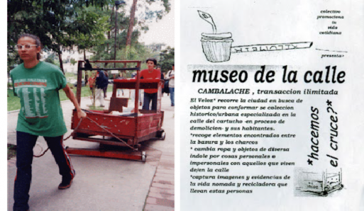 En 1999, Carolina Caycedo (1978-) y el grupo de amigos universitarios con quienes conformó el Colectivo Cambalache (1997) recorrieron las calles de la ciudad, desde el barrio La Soledad hasta el barrio Venecia, haciendo una parada obligada en la célebre “olla” del “Cartucho”1, llevando consigo “El Veloz”, un carro de balineras para reciclaje. La acción fue titulada El museo de la Calle, pues El Veloz cargaba objetos varios disponibles para el trueque con los transeúntes: llegados a un punto, las cosas se instalan en el suelo, se exponen sobre el carro, se disponen al intercambio de objeto por objeto. Y son los habitantes de la calle los principales asistentes y sorprendidos, no solo de que el término museo hiciera la calle y llegara hasta ellos, sino de que sus posesiones–un zapato, una pipa de basuco, un cuchillo, un pedazo de papel–adquirieran valor de cambio y de que, con ellos, su participación en este circuito fuera posible. El Colectivo Cambalache rearticula el mundo en las calles mismas de la ciudad. Con el transcurrir del carro y de las horas, los objetos iniciales ya no están y el museo se empieza a poblar de seres materiales extraños, pero representativos de esta vida del afuera del circuito comercial de las cosas y su ciclo de vida, tal y como, relata Caycedo: