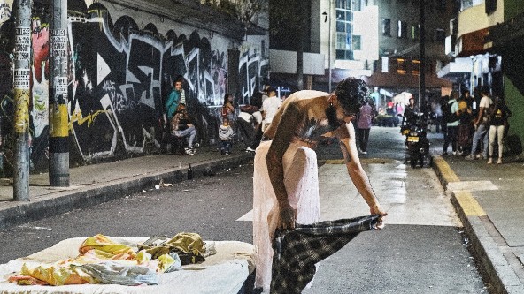 La performance comenzó con el artista Stiven Bohórquez saliendo de un inquilinato en ropa interior. Él caminó hacia la cama y prenda por prenda se cargó de todas las identidades contenidas en el vestuario previamente expuesto sobre la misma. Con las prendas puestas, y las mil vidas que ello representa,4 procedió a acostarse, acobijarse con las sábanas, también provenientes del motel, y aguardar el punto de inflexión de la noche: si bien la acción estaba pensada para abarcar una jornada laboral completa como discurso reivindicatorio de este quehacer, es decir, 8 horas ininterrumpidas, terminó por acabarse tras el paso de poco más de la mitad del tiempo puesto que grupos armados al margen de la ley decidieron interrumpir la acción y cuestionar sus fines. Esto último, a diferencia de lo que podría pensarse, no fue una intervención destructiva de la obra, sino precisamente el símbolo final perfecto para dejar en claro la ejecución de la norma no regulada en el espacio, sus significados, significantes e implicaciones. Tras la exigencia el artista procedió a quitarse nuevamente la ropa, prenda por prenda, luego caminó nuevamente en ropa interior por las calles del centro de la ciudad y se perdió en la oscuridad del pasillo de ingreso al inquilinato desde el cual la acción había iniciado.