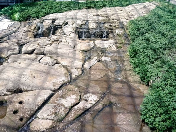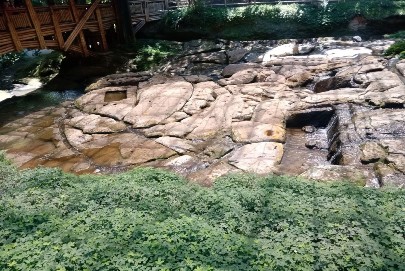 En el lecho del río, una serie de tallas sobre el manto rocoso al borde de la cuenca del río que data de hace tal vez 5.000 a 2.000 años (Álvarez, 2012), se inscriben unas geografías sobre las rocas que parecen imitar a escala las zonas hídricas, las montañas circundantes y formas geométricas como círculos o rectángulos, que parecen representar los territorios de asentamiento humano. Dentro de estas figuras geometrizadas, los surcos que parecen presentar los ríos circundantes permiten el flujo del agua que desde el río baña y llena estas formas (Figuras 1 y 2). Además, están talladas dentro y fuera de estas geometrías figuras antropomórficas de mujeres en labor de parto, cabezas humanas, y representaciones zoomórficas como serpientes, lagartijas y tortugas; todas ellas en culturas cercanas, asociadas con la fertilidad, con el paso de una sustancia a otra, de un mundo a otro, del agua a la tierra: anfibios que son mediadores, animales de paso y transición, es decir, umbrales (Figura 3).