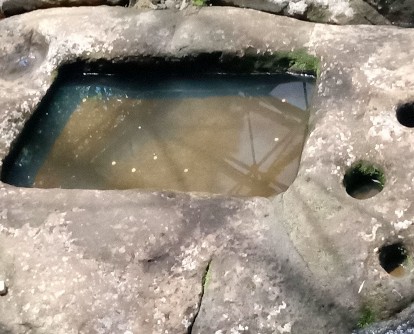 El espejo de agua secundario que refleja el cielo en la piedra y el universo en el inframundo. Fuente del Lavapatas. San Agustín, Huila, Colombia. Foto: Diego Aguilar. 2023.En medio de lo sintagmático de las voces que producen las imágenes labradas en la roca, el Lavapatas contiene sintaxis mayores cuando los objetos mínimos y más pequeñosconstruyen imágenes y discursos más grandes. Se destaca la figura de la “gran madre”, que está compuesta en la cabeza por uno de estos espejos de agua. En esta imagen, los ojos y la nariz son las tres ranas que yacen dentro del espejo acuático, cuyo cuello y brazos son las ramificaciones de las cuencas hídricas presentadas a escala. Sus piernas, abiertas en labor de parto con un montículo que es el hijo que se da a luz para construir el mundo de los humanos. (Figuras, 5 y 7). Así, cargas y capas se constituyen en el estar e interactuar corporalmente con las imágenes que están inscritas en la roca humedecida por el agua.