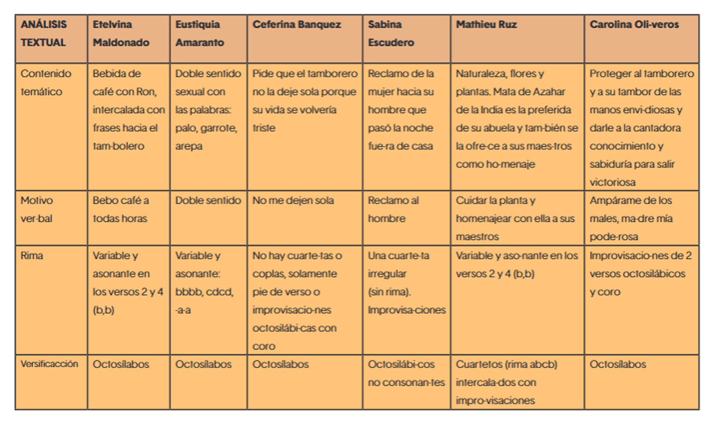 Abstract: Bullerengue is a music and dance practice influenced by West African black musical traditions that includes drummers, dancers, and singers. In recent decades, the vocal interpretation of bullerengue has changed and become more relevant. This article presents a musical analysis of the rhythmic, melodic, and textual structure of some representative songs of the bullerengue tradition, as well as an acoustic evaluation of the voice in these songs, using parameters such as resonance, timbre, pitch, and register. The analysis of the bullerengue voice from functional listening is based on vocal concepts from popular singing, such as mixed register and twang vocal configuration, alongside cultural elements of the Afro-Colombian tradition. The interpretations of six Colombian singers are analyzed: Etelvina Maldonado de la Hoz, Eustiquia Amaranto, Ceferina Banquez, Sabina Escudero, Mathieu Ruz Lobo, and Carolina Oliveros. Although they have different ways of singing bullerengue, linked to their histories and contexts, they interpret bullerengue as a common musical expression.