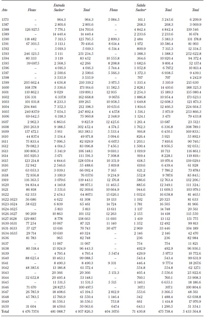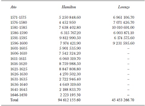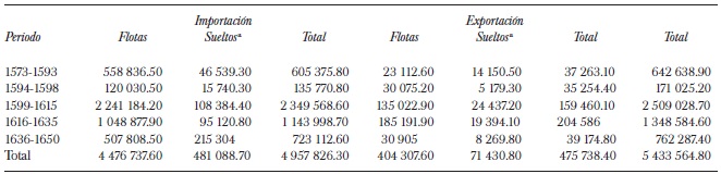 Durante el periodo comprendido entre 1573 y 1650, con lagunas existentes en la documentación,22 se recaudaron en la Caja de Veracruz, por concepto de almojarifazgo, un total de 5 433 564.80 pesos, de los cuales 4 957 826.40 pesos corresponden a lo cobrado de derechos de importación (91.2%) y los restantes 475 738.40 pesos por la exportación (8.8%).23 A partir de estas dos cantidades y de su evolución hemos calculado el valor total de las mercancías del comercio de Veracruz que ascendió a 72 836 207 pesos, de los cuales 53 798 475 pertenecen a las importaciones y 19 037 732 pesos a las exportaciones. La balanza comercial del puerto, como puede apreciarse, fue negativa con 19 037 732 pesos. Esta fue compensada con la exportación de numerario, ya estudiada por Hamilton y Lorenzo (véase cuadro 1).