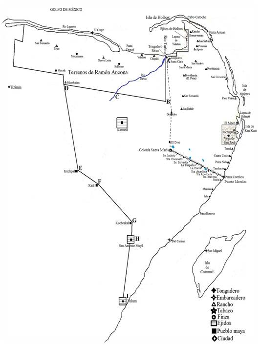 Es Faustino Martínez el que logra apropiarse de los bosques y consolidar los circuitos comerciales forestales a favor de la economía mexicana, afrontando los retos que representan la guerra social de los mayas sublevados y los cortes furtivos de los madereros ingleses de Honduras británica. Entre 1889 y 1893, el empresario navarro logra el deslinde, la propiedad y la explotación de un vasto terreno entre cabo Catoche y Tulum, el más importante realizado en la zona, logra así lo que sus predecesores, Ibarra, Sierra y Antonio Espinosa no pudieron, al convertirse en el dueño de 7 232 kilómetros cuadrados de tierras y sus bosques en la costa oriental de Yucatán (véase mapa 1), cuyo valor se estima en 361 625 pesos. Además, en 1898 se le otorga una autorización para el arrendamiento de un terreno nacional con extensión de 7 000 kilómetros cuadrados en las márgenes del río Hondo por la que paga 350 000 pesos, en la que lleva a cabo el usufructo de recursos maderables (véase mapa 2).14 Con ambas concesiones el empresario navarro controla 14 232 kilómetros cuadrados de la península yucateca, 15.6% de la entidad. De hecho, ningún otro terrateniente del sureste mexicano como Olegario Molina, Eusebio Escalante, Ramón Ancona, Policarpio Valenzuela, Luis Hüller o los hermanos Bulnes, tienen bajo su control tal extensión de terrenos.15 De ahí que Faustino Martínez es considerado el dueño de Yucatán por la prensa capitalina.16 Si para ese entonces el gestor campechano Manuel Sierra Méndez se autodenomina el marqués de Cozumel,17 el empresario navarro se gana la alegoría con el duque de Westminster sir Hugh Grosvenor, quien en la misma época era el dueño de medio Londres.18 Además, al ser un personaje ligado a la presidencia de la república, sus posesiones y actividades extractivas son idóneas para el proyecto de creación de un territorio federal que se consolida en 1903, Quintana Roo, pues es dueño de 28.4% de los bosques de la costa oriental de Yucatán.