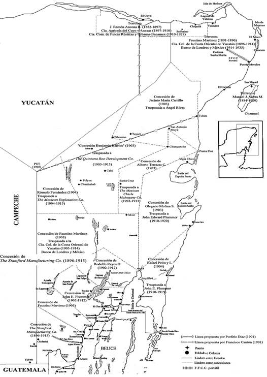 Uno de los principales negocios de Faustino Martínez es el deslinde, ocupación y explotación de los terrenos y bosques existentes en la costa oriental de Yucatán al observar la oportunidad de negocio como proveedor de materias primas al mercado internacional. Su afán de lucro le permite ser partícipe del sistema de concesiones forestales que otorga el gobierno mexicano y afronta lo retos que representa esta región de frontera-borde forestal donde se beneficia, junto con sus socios. Por su situación adyacente a las posesiones inglesas de Honduras británica y por ser una zona de guerra con los mayas sublevados, la región indómita y semidespoblada del oriente yucateco la concebimos como un espacio resultado del proceso histórico, la imbricación de sucesos, intereses y actores, en donde se disputa el control territorial, el usufructo de recursos maderables, la demarcación fronteriza, y se consolida el territorio federal de Quintana Roo en los albores del siglo xx. Se trata de una región de frontera forestal con extensión de 50 000 kilómetros cuadrados, rica en recursos maderables para la construcción, la ebanistería y la tintórea –caoba, cedro, palo de tinte, chicozapote, jabín, entre otras–, que conforman la economía de extracción y que la insertan en el mercado internacional como proveedor de materias primas desde el siglo xvii hasta mediados de la centuria pasada. Un espacio donde se presentaron los intereses de los comerciantes-madereros ingleses, los mayas orientales, los empresarios yucatecos y campechanos, que gracias a la estabilidad lograda por la política y la paz porfirianas se logran establecer marcadores económicos de soberanía (Nelken-Terner, 1997, pp. 148-166; Rangel, 2014, pp. 4-6), a partir de las autorizaciones otorgadas por el sistema de concesiones que beneficia a ciertos empresarios. Estos marcadores son un conjunto de elementos vinculados, la existencia de recursos naturales y tierras, un régimen político estable, el andamiaje legal necesario para ordenar las relaciones y actividades económicas, el capital nacional y extranjero, el afán de lucro y el usufructo que mostraron Felipe Ibarra Ortoll, Manuel J. Sierra, Faustino Martínez, The Stamford Manufacturing Co., Rafael Peón, Olegario Molina, Rodolfo Reyes y John E. Plummer. Todos estos aspectos favorecieron la negociación del Tratado Mariscal-St. John y la confirmación del borde limítrofe del sureste mexicano en 1898.