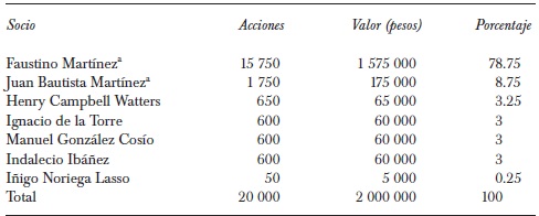 La novedosa y multifacética empresa de Martínez, de la que es socio mayoritario y gerente por nueve años (1896-1905), le permite ensanchar intereses con sus socios y amigos con los que conforma el consejo de administración. Empresarios, propietarios-terratenientes, políticos y capitalistas nacionales y extranjeros avecindados en la ciudad de México como Manuel González, quien ocupa la presidencia (1896-1901), Henry C. Watters, que funge como vicepresidente (1896-1910), Juan B. Martínez como comisario propietario e Íñigo Noriega como comisario suplente (1896-1900), Ignacio de la Torre, vocal e Indalecio Ibáñez, secretario (1896-1905), cada cual con una participación en el capital inicial (véase cuadro 2).30 Igualmente, encontramos diversos nombres de empresarios consentidos del porfiriato que ocupan la presidencia, como Thomas Braniff Woods (1901-1905) y José Sánchez Ramos (1905-1910), que sustituyen en la dirección a Martínez, como Ruperto Crespo (1905-1906) y Ángel Rodrigo Fernández (1906-1908), o se convierten en representantes legales como Alphonse Mitchell. Así como también una serie de consejeros de la talla de Tomás Braniff Ricard, Adolfo Prieto, Indalecio Sánchez Gavito, León Signoret, Enrique Tron, Arturo Hube, Guillermo Hopfner, Philip Robertson, William B. Mitchell, Pablo Macedo, Francisco Garza, Aurelio Díaz, A. Sánchez Juárez, entre otros (Rangel, 2014, pp. 361-366).