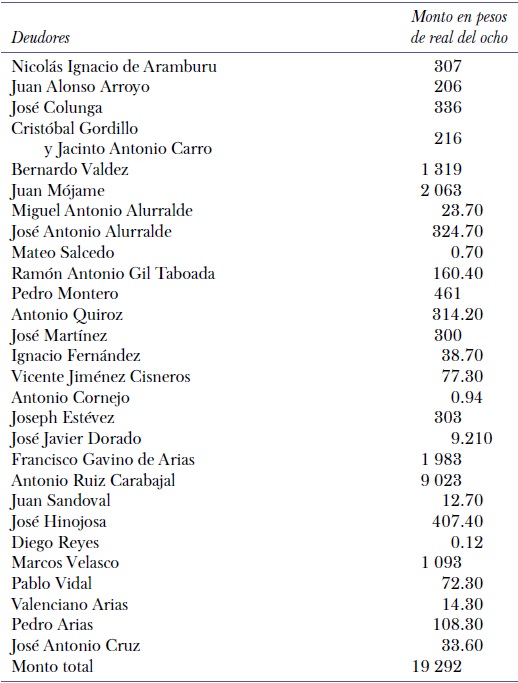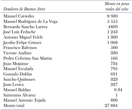 La aparición de deudores en Buenos Aires invita a revisar aquellas afirmaciones historiográficas, que marcaron una situación de dependencia por parte de los comerciantes del interior respecto de unas cuantas líneas de crédito habilitadas por los comerciantes porteños (Gelman, 1990). Obsérvese que la cadena espacial de circulación de los préstamos de Moldes no se concentró en el espacio peruano, sino al sur, en la capital del virreinato del Río de la Plata (véase cuadro 1). El importe total adeudado por los porteños en 1772 asciende a casi 30 000 pesos.