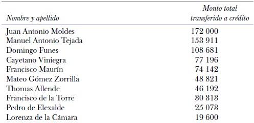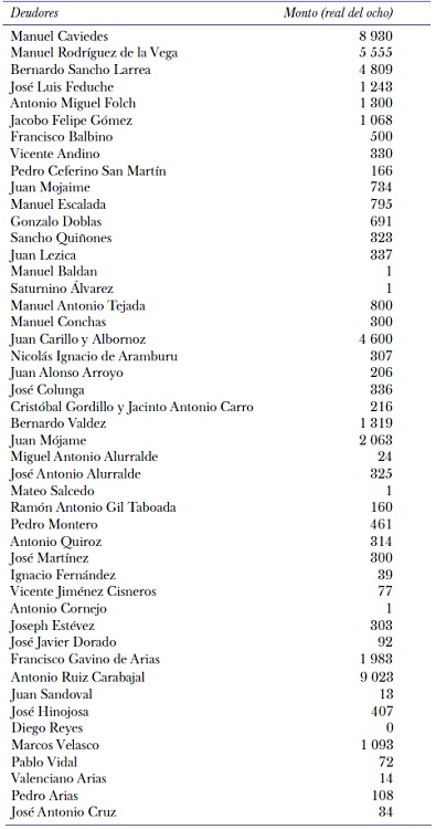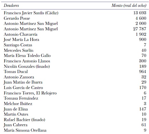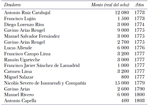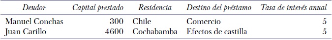 El espacio de circulación de sus transferencias crediticias se amplía aún más si consideramos a sus deudores en Chile y Cochabamba, en la Intendencia de Santa Cruz. En Chile, fue Manuel Conchas quien contrajo un préstamo por 300 pesos, su deudor en la ciudad altoperuana fue el comerciante Juan Carillo y Albornoz por 4 600 pesos, crédito que invirtió para financiar sus ventas de efectos de castilla en la plaza cochabambina (véase cuadro 2).18