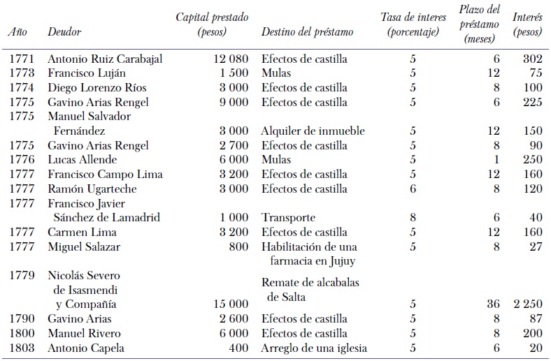 El comerciante de efectos ultramarinos Francisco Lima solicitó un crédito a su favor por 3 200 pesos, se obligó a retribuirlo en dos partes: una primera mitad del monto en cuatro meses y la segunda en ocho.28 Juan Miguel Salazar recibió a crédito 800 pesos para abrir una botica y vender efectos de castilla en la ciudad de San Salvador de Jujuy, centro urbano colindante a la ciudad de Salta.29